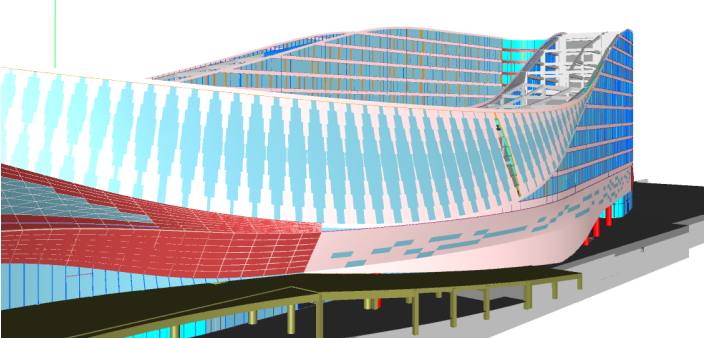 建筑設(shè)計(jì)為異形絲綢流線造型,結(jié)構(gòu)輔以大跨度鋼構(gòu)。因流線型造型給主體輪廓提出了更精準(zhǔn)的要求,利用BIM技術(shù)根據(jù)幕墻模型確定各功能分區(qū)各層樓板邊界輪廓、及相關(guān)交界面,確保項(xiàng)目的美觀。