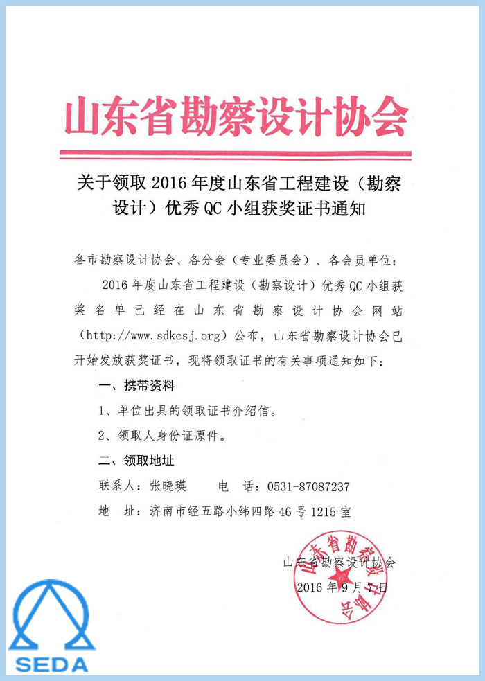 關(guān)于領(lǐng)取2016年度山東省工程建設(shè)(勘察設(shè)計(jì))優(yōu)秀QC小組獲獎(jiǎng)證書通知