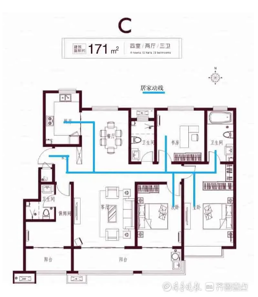 《后漢書·仲長統(tǒng)傳》:“安居樂業(yè),長養(yǎng)子孫,天下晏然?!蓖×苏f,一個家庭有一個安定的居所,是子孫后代安心工作和生活的保障;往大了說,一個國家的公民能居有定所,老有所依,是整個國家安定發(fā)展的基礎(chǔ)。坊間一直流傳著一句笑話就是“丈母娘推動了中國房地產(chǎn)行業(yè)的飛速發(fā)展”,雖然是玩笑話但也多少反映了房子承載著中國人血脈里的歸屬感。世俗的中國人都避不開的問題就是買房,而買房動輒幾百萬的支出也確實(shí)是一個家庭非常重大的決策了,一定要謹(jǐn)慎再謹(jǐn)慎,仔細(xì)挑選各方面都心儀的房子。作為九零后代表,我跟大家談?wù)勎倚哪恐械暮梅孔?。很多朋友在買房的時候比較關(guān)心的就是價(jià)格、地段、戶型、樓層、環(huán)境等,一間舒適的房子,干凈整潔的室外環(huán)境、貼心周到的物業(yè)服務(wù)、低密度的空間是錦上添花,實(shí)際居住起來最要緊的還是戶型,而戶型最重要的則是動線。一所好房子不在于戶型多么大,裝修多豪華,零零碎碎的日子過起來,舒服才是最重要的。而戶型動線影響著人的日常生活起居、大小事情,如果動線不合理,就造成住戶日常生活行動在各個功能區(qū)間交叉行走,影響其他家庭成員的活動,還造成了空間的浪費(fèi),以現(xiàn)在的房價(jià)浪費(fèi)一平米那損失的直接就萬元起了??赡芎枚嗯笥巡⒉幻靼谆蛘卟]有注意過戶型動線是什么。所謂戶型動線,是指根據(jù)住宅結(jié)構(gòu)分布而成的主要活動路線。不同的區(qū)域有不同的動線設(shè)計(jì)方式,主要包括居住動線、家務(wù)動線和訪客動線,不同的動線功能也不同。我以四建一個項(xiàng)目的戶型給大家做如下講解。