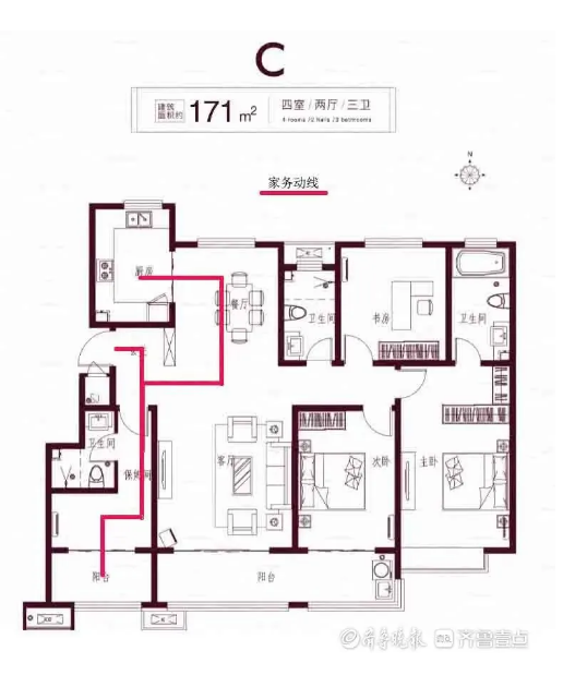 家務(wù)動線顧名思義,是指在家務(wù)勞動中形成的移動路線,主要包括做飯、洗衣服、晾衣服和打掃衛(wèi)生等。涉及的空間主要集中在廚房、衛(wèi)生間和陽臺。家務(wù)動線在三條動線中用得最多,也最繁瑣,所以在買房的時候一定要注意順序的合理安排,避免動線過于重復(fù),否則會讓家務(wù)勞動的過程變得更辛苦。按照一般的做飯習(xí)慣,都是先去冰箱拿食材,然后清洗處理,最后在灶臺煎炒烹炸。食材的拿取、處理、烹飪就是廚房的三角動線。只要你的廚房活動是在三角動線的三條邊上,就能保證不會來回反復(fù)的拿取清理東西,也就保證了廚房動線的合理性。此戶型還設(shè)有保姆間并配有獨(dú)立衛(wèi)生間,將家政人員活動區(qū)域與主人活動區(qū)域分隔開,最大限度避免了對居住區(qū)的影響。