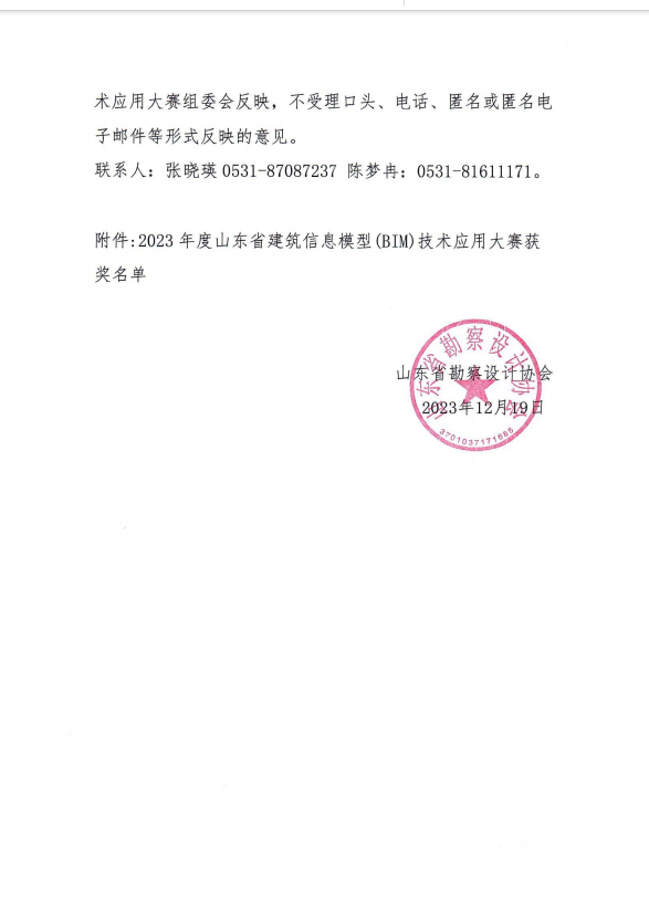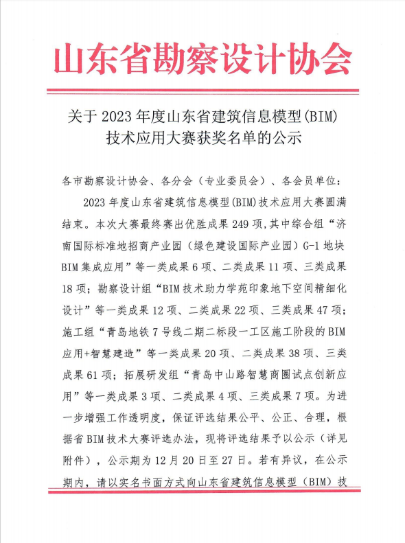 附件:1.《關于2023年度山東省建筑信息模型(BIM)技術應用大賽獲獎名單的公示》