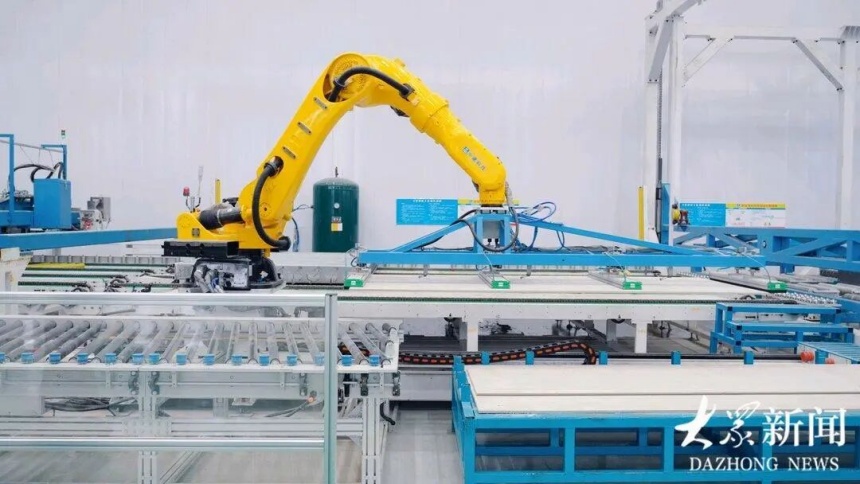 造房工廠里,工人正在給造房機(jī)器人發(fā)送指令,造房機(jī)器人在一條百米長的CMC智能生產(chǎn)線上高效流暢協(xié)同作業(yè)。僅需12分鐘,即可制造完成一面墻板;僅需2小時(shí),一間模塊化房屋即可制造完成下線。