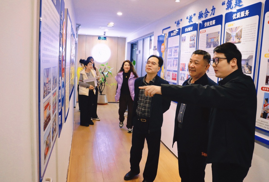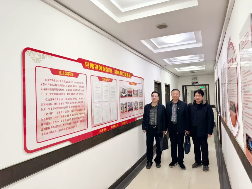 調(diào)研期間,在省勘察設(shè)計(jì)協(xié)會(huì)理事長(zhǎng)顧國(guó)棟、秘書(shū)長(zhǎng)單寶艷陪同下,劉躍奎教授參觀了協(xié)會(huì)黨建活動(dòng)室、黨建文化墻及協(xié)會(huì)文化宣傳欄。參觀過(guò)程中,協(xié)會(huì)負(fù)責(zé)人詳細(xì)介紹了在黨建陣地建設(shè)、特色文化培育以及成果宣傳方面的經(jīng)驗(yàn)與成效。與會(huì)人員還參觀了山東省建設(shè)科技與教育協(xié)會(huì)文化墻與宣傳欄,直觀感受協(xié)會(huì)黨建工作成果與行業(yè)發(fā)展特色。